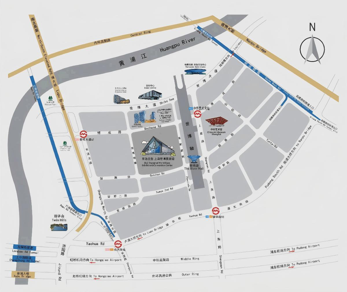 她连接南浦大桥、卢浦大桥、打浦路隧道、西藏南路隧道等过江要道,坐拥周边数十条公交线路,轨道交通7、8、13号线可直达展馆。