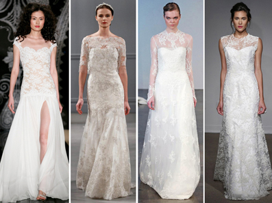 2014春夏纽约婚纱周刚刚走过,从材质来看,蕾丝婚纱是永不过时的潮流,2014春夏婚纱蕾丝风当然是如此,那些浪漫的蕾丝婚纱更成为了品牌秀场上的主角。无论是在裙摆,或是领口设计,又或是腰间的蕾丝魅力,都无法抵挡这股潮流之风。