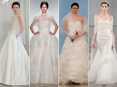 简单的薄纱、蕾丝长袖,不自觉地将一件朴素单一的婚纱礼服增添了一种华丽美。这样的婚纱设计在2014的秀场上大展风采。无论是高领、坎肩、中长袖、蕾丝斗篷还是大披肩,都美的如此优雅。
